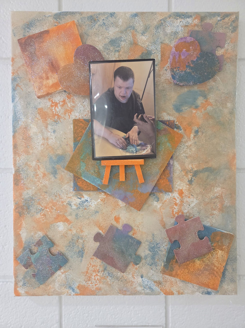 Both brothers, who are nonverbal, used their artwork as a powerful form of communication —expressing thoughts, emotions, and experiences in ways that words cannot. Danny’s piece, titled Danny’s Dream, features layered textures and imaginative elements that reflect how he sees and feels the world. He was filled with pride and excitement seeing it displayed.